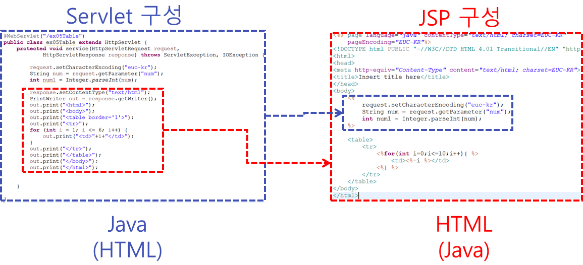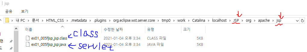 - jsp(hello.jsp) > servlet(hello_jsp.java) > class(hello_jsp.class) > html(.html)로 변환되어 실행됨