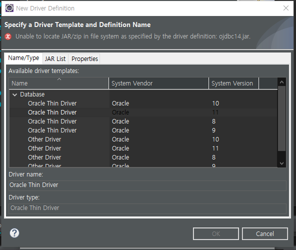 Oracle Thin Drive - Oracle - 11로 눌러준후 JAR List 클릭.