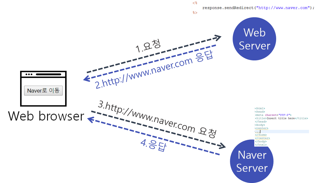 response.sendRedirect() : 현재 실행 중인 JSP page의 실행을 중단하고 다른 Web page가 대신 호출되도록 만드는 기능