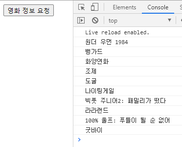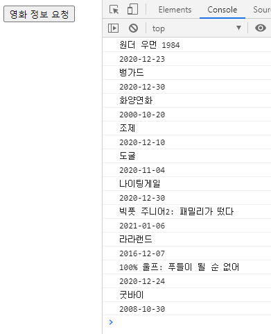 영화 제목과 함께 개봉일까지 가져와봅시다. 개봉일은 아까 캡쳐본을 참고하면 어디에 위치해있는지 알 수 있으며 어렵다면 영화 오픈 api를 가져온 사이트를 참고해도 좋습니다.